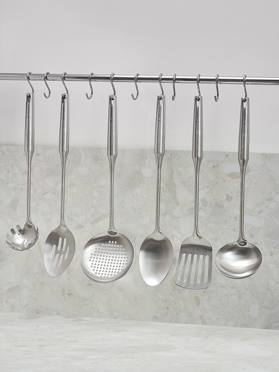 Коллекция Pure включает столовые приборы и кухонные принадлежности. Это изделия из нержавеющей стали, которые удачно сочетают лаконичную эстетику и практичную функциональность. Цельнометаллическое исполнение обеспечивает их повышенную прочность и долговечность. Универсальный минималистичный дизайн органично вписывается в интерьер любой кухни, а продуманная эргономика делает процесс готовки комфортным. Стальные изделия не впитывают запахи. Все предметы коллекции можно мыть в посудомоечной машине. Ручки поварских принадлежностей снабжены отверстием для компактного вертикального хранения, что экономит пространство на кухне.