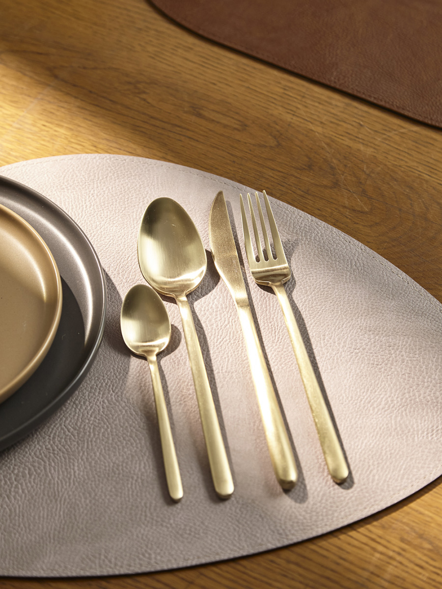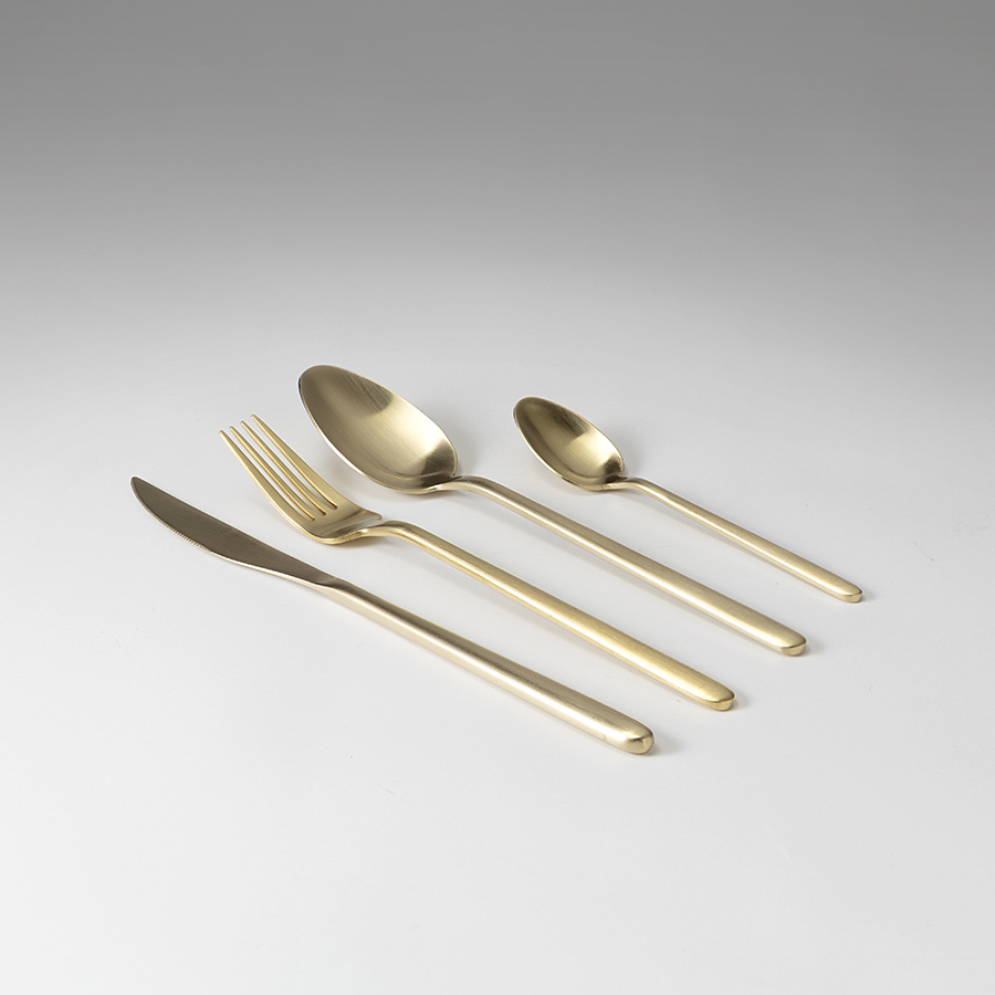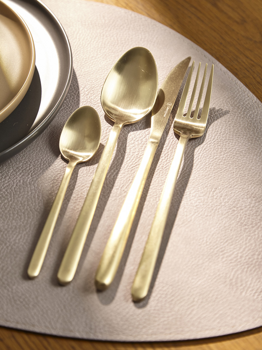 - Столовые приборы золотистого цвета с матовой полировкой отлично подойдут для сервировки в традиционном и современном стиле. Их сдержанная элегантность прекрасно гармонирует с простыми формами и нейтральными цветами.