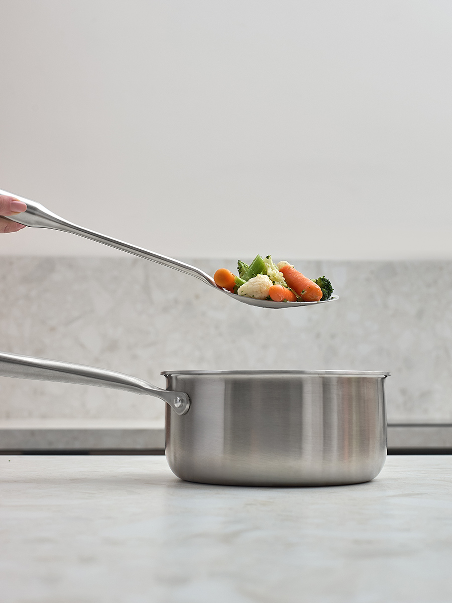 Коллекция Pure включает столовые приборы и кухонные принадлежности. Это изделия из нержавеющей стали, которые удачно сочетают лаконичную эстетику и практичную функциональность. Цельнометаллическое исполнение обеспечивает их повышенную прочность и долговечность. Универсальный минималистичный дизайн органично вписывается в интерьер любой кухни, а продуманная эргономика делает процесс готовки комфортным. Стальные изделия не впитывают запахи. Все предметы коллекции можно мыть в посудомоечной машине. Ручки поварских принадлежностей снабжены отверстием для компактного вертикального хранения, что экономит пространство на кухне